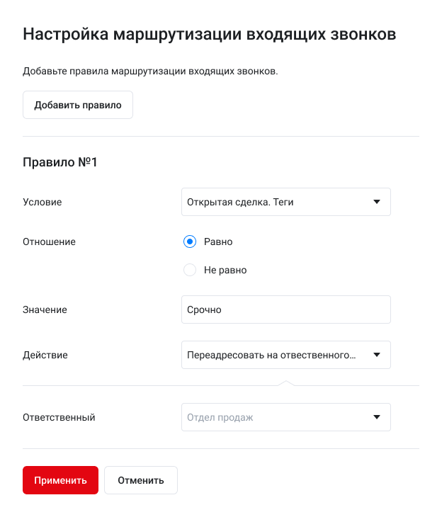 Умная маршрутизация автоматически направляет входящий звонок нужному сотруднику или отделу, используя теги из карточки клиента, компании или сделки, а также учитывает рабочее время. Вы можете гибко настроить маршрутизацию под свои задачи.