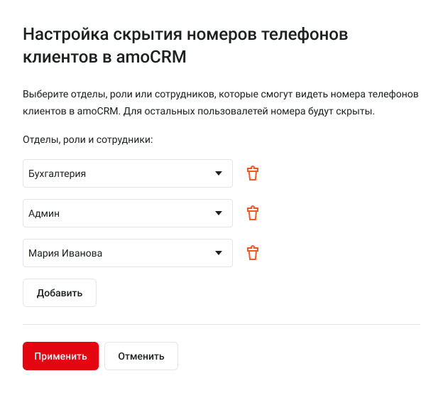 Вы можете скрыть от сотрудников номера телефонов клиентов, чтобы сохранить базу контактов в безопасности, не нарушая рабочий процесс. Номера будут замаскированы с помощью «*”.