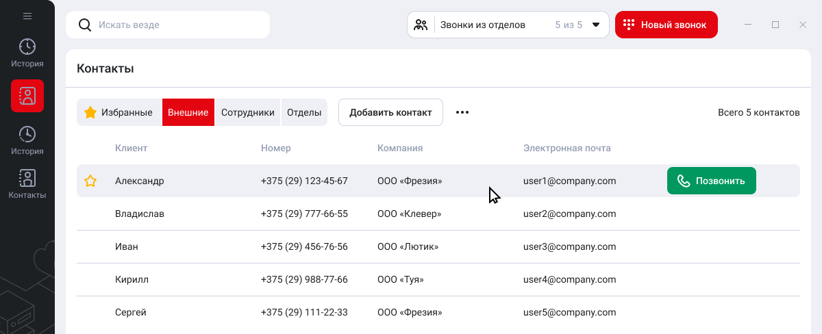 Все контакты синхронизируются между мессенджером и веб-интерфейсом АТС. Ключевые сведения о клиентах будут под рукой у каждого сотрудника. А чтобы не афишировать персональные контакты других руководителей, можете ограничить к ним доступ — такие контакты будете видеть только вы.