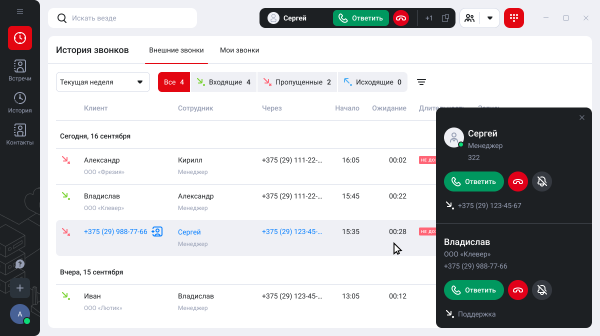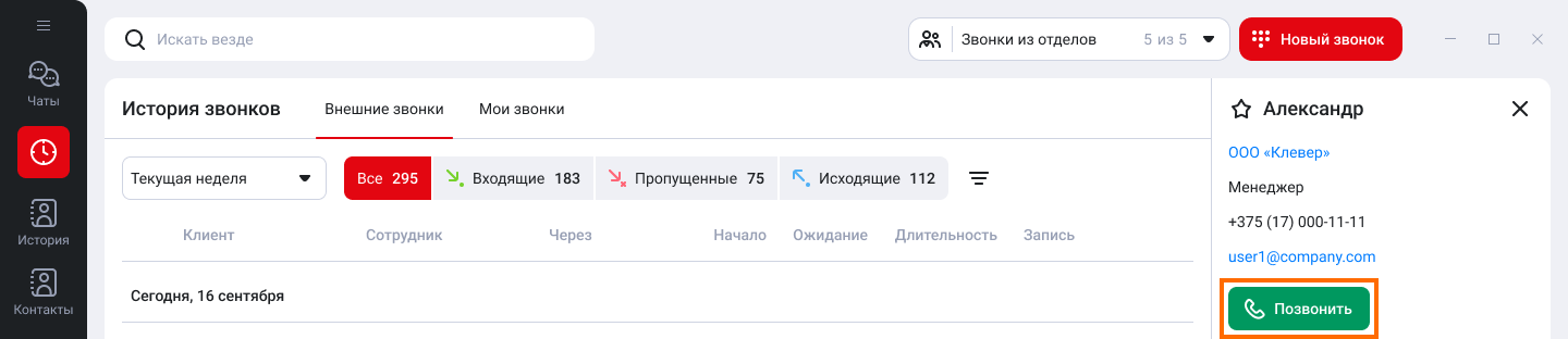 Если у вас пропущенный от клиента и нужно перезвонить как можно скорее, в истории звонков наведите курсор на нужный вызов и нажмите на кнопку «Позвонить» в правой части экрана.