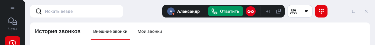 Если не готовы ответить, но не хотите сбрасывать, то можно отключить уведомление о звонке, нажав на колокольчик, и скрыть карточку звонка, нажав на крестик. Даже если карточка звонка скрыта, можно принять звонок через кнопку «Ответить» в верхнем меню корпоративного мессенджера.