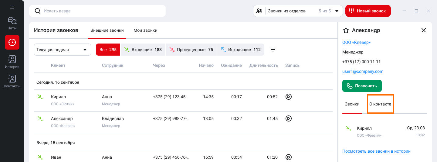 Если у клиента несколько номеров, также из карточки контакта вы можете позвонить на его дополнительный номер. Для этого в карточке перейдите на вкладку «О контакте».