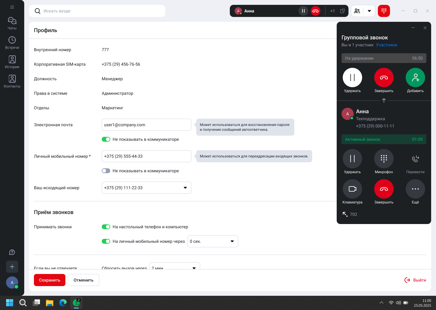 Карточка вызова открывается в отдельном окне, не мешая вам работать с другими приложениями. В карточке звонка доступны все основные функции: удержание, перевод, отключение микрофона, добавление участников в звонок.