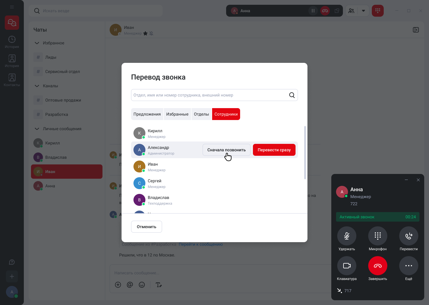 Чтобы перевести вызов, нажмите на кнопку «Перевести» в карточке звонка. Появится окно с вкладками «Отделы» и «Сотрудники». На вкладке «Сотрудники» можно выбрать способ перевода — перевести сразу или сначала позвонить.