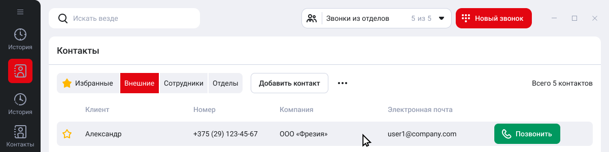 Чтобы начать звонок из карточки контакта, нажмите на кнопку «Позвонить» в правом верхнем углу.