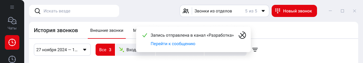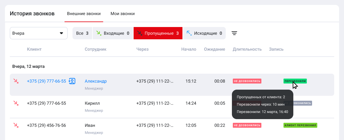 При переходе в историю новый пропущенный звонок подсвечивается красным. Уведомление исчезает, если долго держать вкладку с новым пропущенным открытой или если кто-то из сотрудников перезвонит этому контакту. Чтобы перезвонить по пропущенному, наведите курсор на соответствующую строку и нажмите на кнопку «Позвонить» справа.