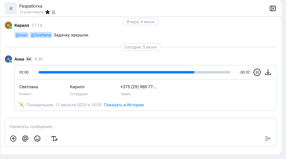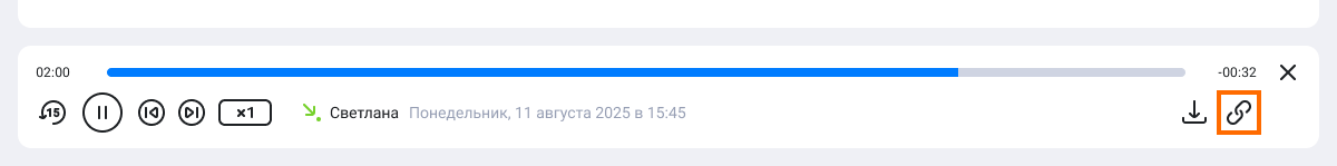 Чтобы поделиться записью звонка в чате, в проигрывателе нажмите на иконку ссылки в правом нижнем углу.
