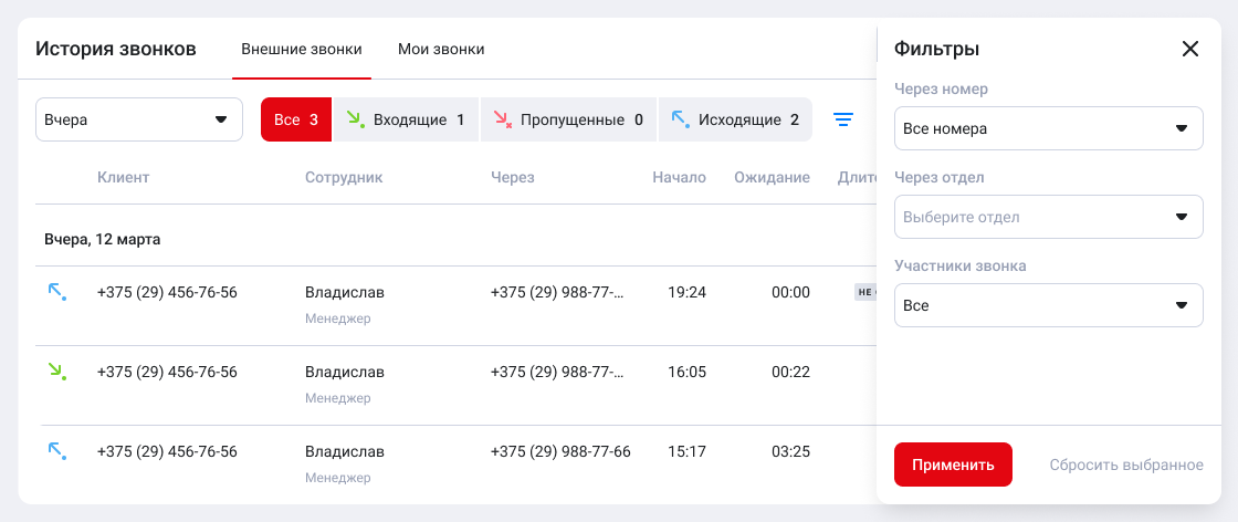 Выберите нужные вам значения фильтров и нажмите «Применить». В таблице останутся только те звонки, которые соответствуют заданным параметрам.