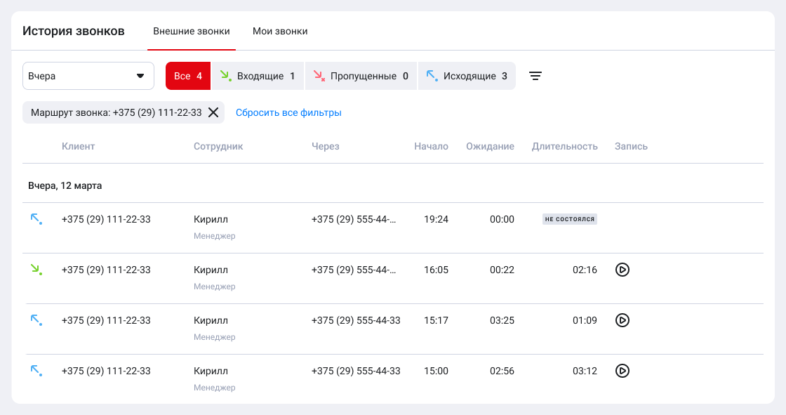 Благодаря фильтру «Контроль пропущенных» вы сможете легко найти непринятые звонки, на которые сотрудники не перезванивали или не дозвонились.