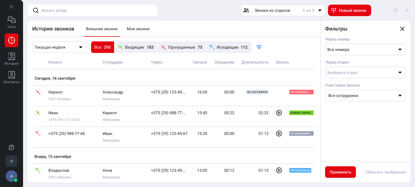 • фильтровать звонки по номерам, отделам, сотрудникам, клиентам и типам вызовов за нужный период;