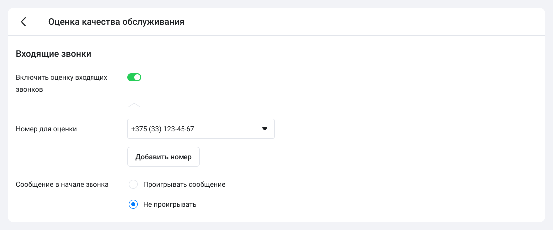 2. Включите оценку входящих звонков. В появившемся поле укажите номера АТС или номерные группы, на которые будут поступать вызовы, подлежащие оценке. Система будет автоматически предлагать клиентам оценить разговор после завершения беседы.