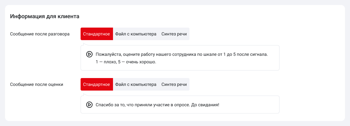 5. Если прямо сейчас у вас нет уникального брендированного аудиосообщения — не проблема! В любой момент можно заменить стандартные сообщения с предложением оценить качество обслуживания и благодарностью за оценку на свои файлы.