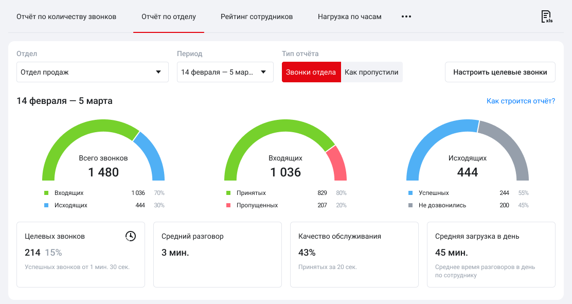 В сводке по всем звонкам можно отслеживать количество звонков, качество обслуживания и средние показатели как по отделу в целом, так и по каждому сотруднику отдела. Также вы можете задать длительность целевых звонков, чтобы оценивать, какая доля вызовов соответствует KPI. Подробнее о том, какие задачи поможет решить этот отчет, — в статье Возможности отчета «Звонки отдела».