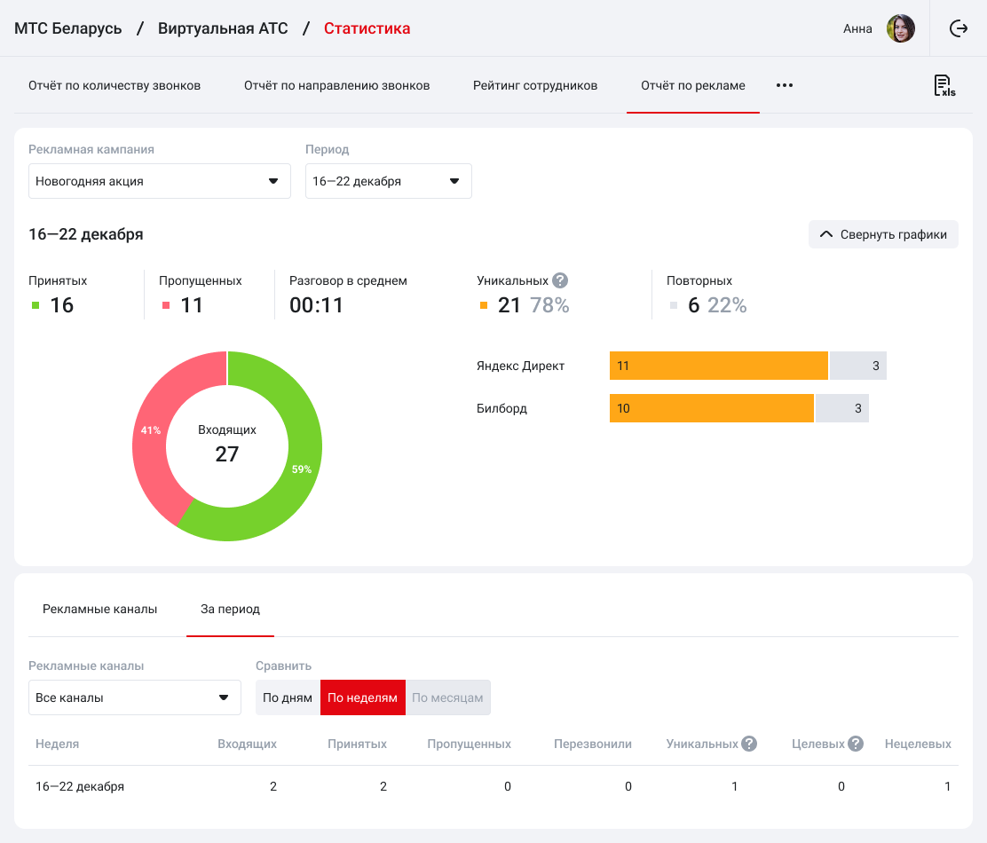 По количеству уникальных входящих звонков, поступающих с каждого рекламного канала, вы определите, для какого канала стоит увеличить бюджет, а от какого — отказаться. Также рекомендуем прослушивать входящие звонки на каждый из номеров, чтобы оценить не только количество, но и качество заявок в зависимости от источника трафика.