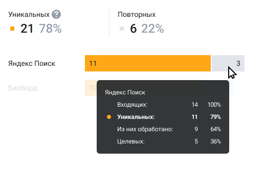 У вас может быть много номеров для разных рекламных каналов. На диаграмме справа вы сможете легко сопоставить каналы по эффективности, ведь в ней отображается не только число уникальных и целевых звонков, но и их доля среди всех звонков с этого источника трафика.