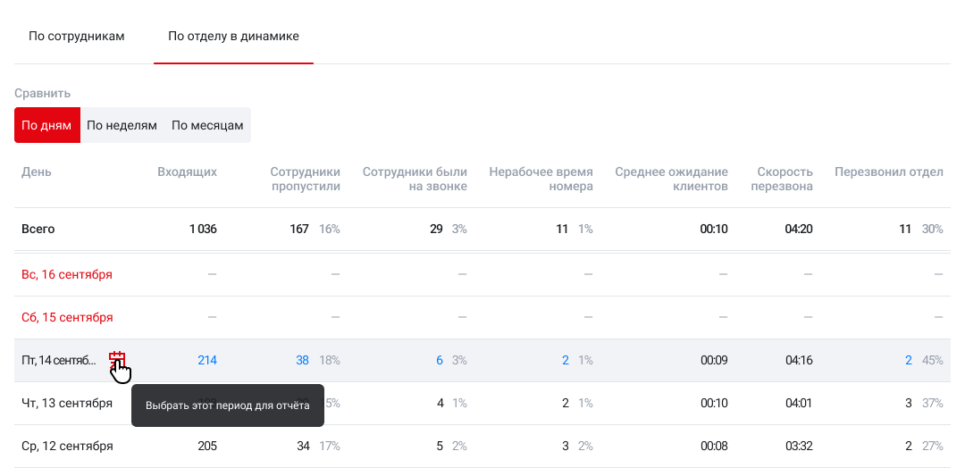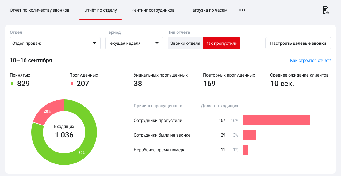 - разбираться, почему звонки в отдел остались без ответа и кто из сотрудников чаще их пропускает.