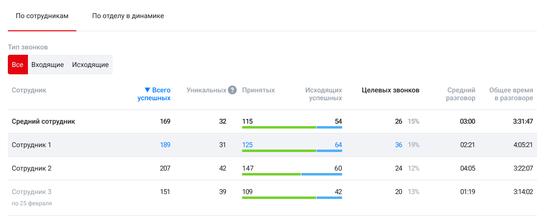 Для оценки вклада каждого сотрудника в результаты отдела используйте таблицу по звонкам сотрудников: по всем вызовам или отдельно по входящим и исходящим.