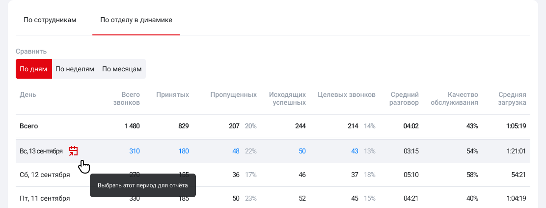 Подробнее изучить отчет по звонкам отдела за интересующий период можно одним кликом, нажав на иконку календаря.