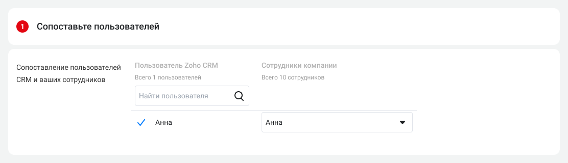 3. Сопоставьте всех пользователей АТС с пользователями Zoho, чтобы системы могли правильно отражать связанные с ними события. В Zoho CRM будут заноситься звонки только сопоставленных пользователей. При добавлении новых сотрудников в будущем тоже необходимо будет их сопоставить.