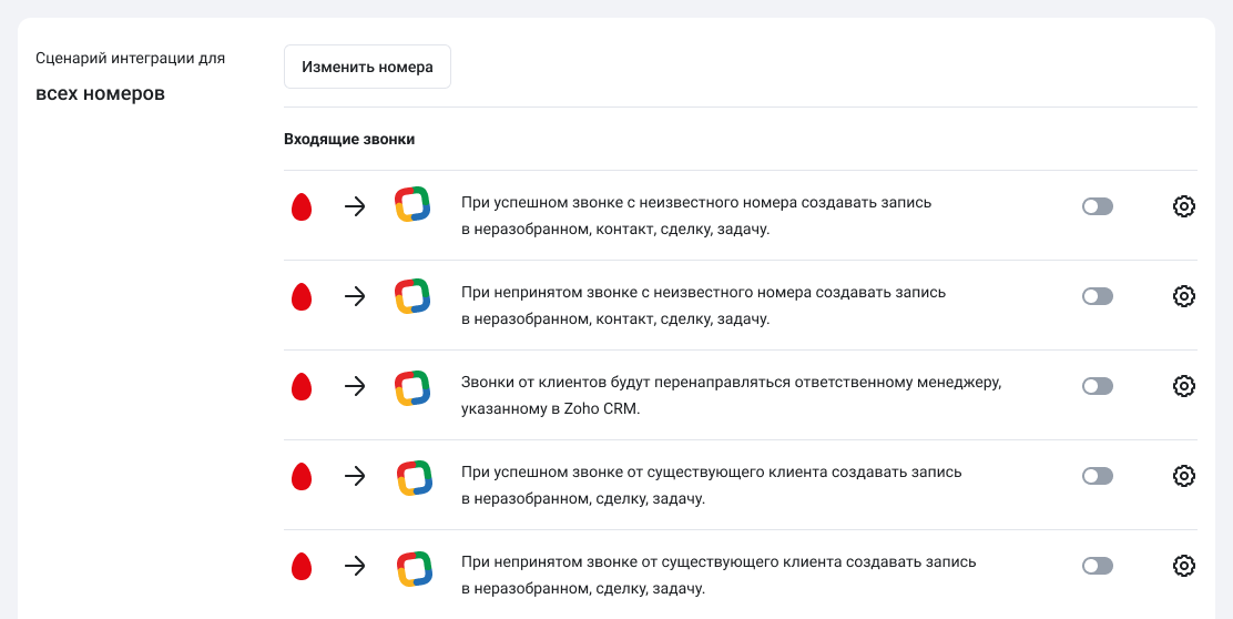 4. Вы можете настроить интеграцию для всех номеров сразу (этот вариант выбран по умолчанию) или для каждого в отдельности. Подробности — в статье «Настройка нескольких сценариев интеграции с CRM».