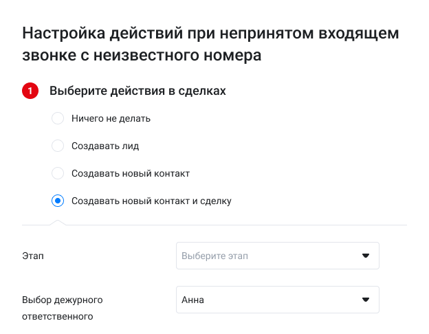 А для звонков, которые обрываются на приветствии, в IVR, при дозвоне в отдел или поступают в нерабочее время, вы можете выбрать дежурного ответственного, который примет звонок на внешнем номере и будет назначен ответственным за лид.